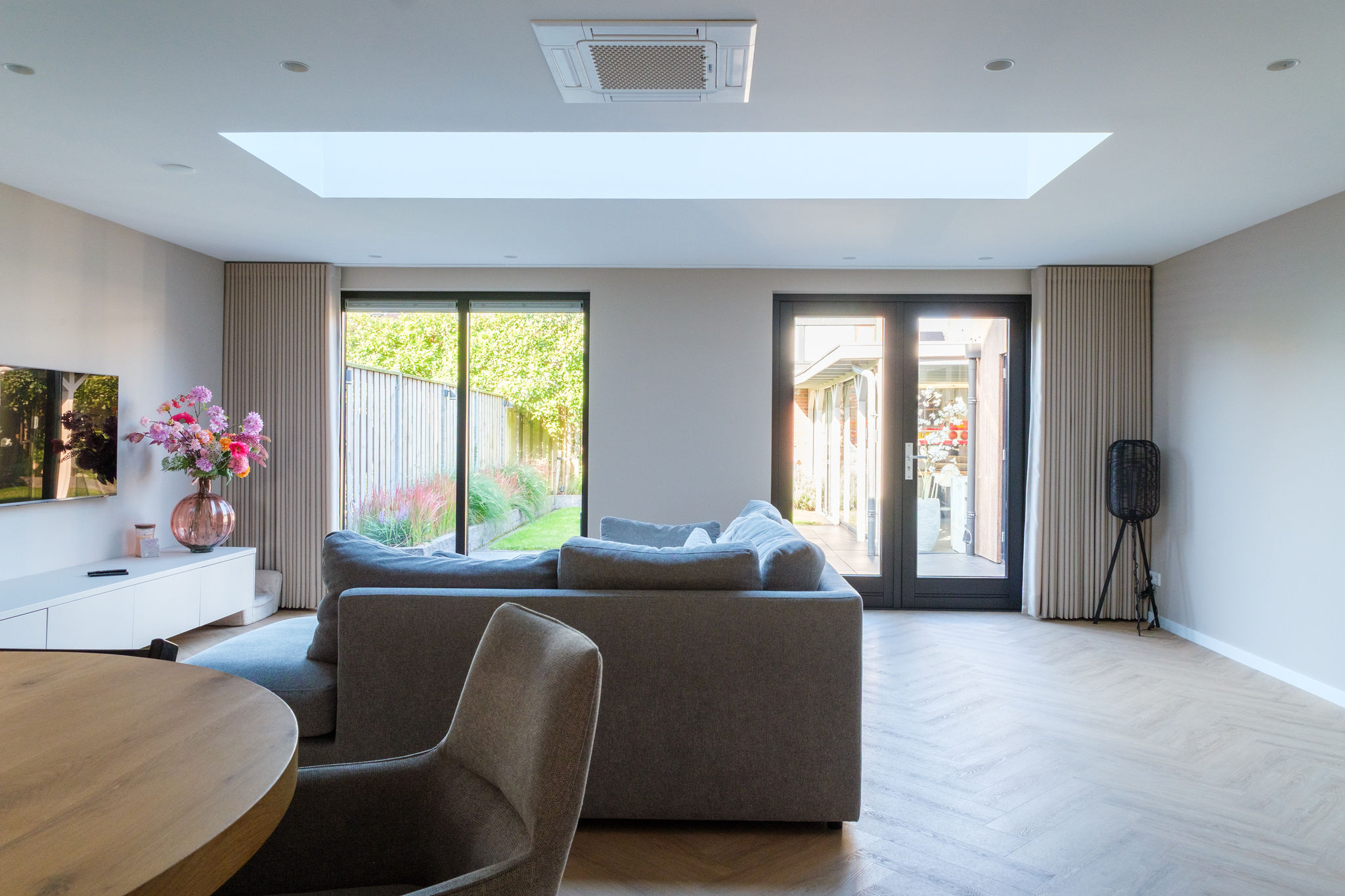 Voor de gevelbekleding is gekozen voor MOSO Bamboo X-treme: een onderhoudsarm en duurzaam materiaal met een warme uitstraling. En dankzij de royale Luxlight Ilummy lichtstraat — uitgevoerd in één grote glasplaat — valt het daglicht nu rijkelijk naar binnen. In combinatie met een zonnescreen blijft het binnenklimaat ook op warme dagen prettig.