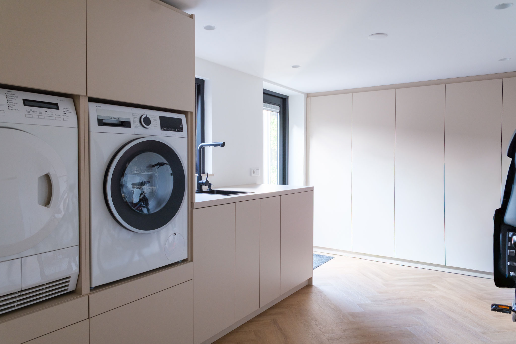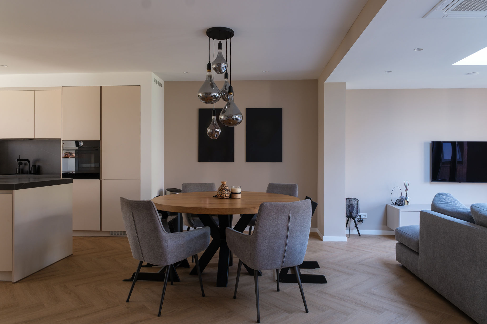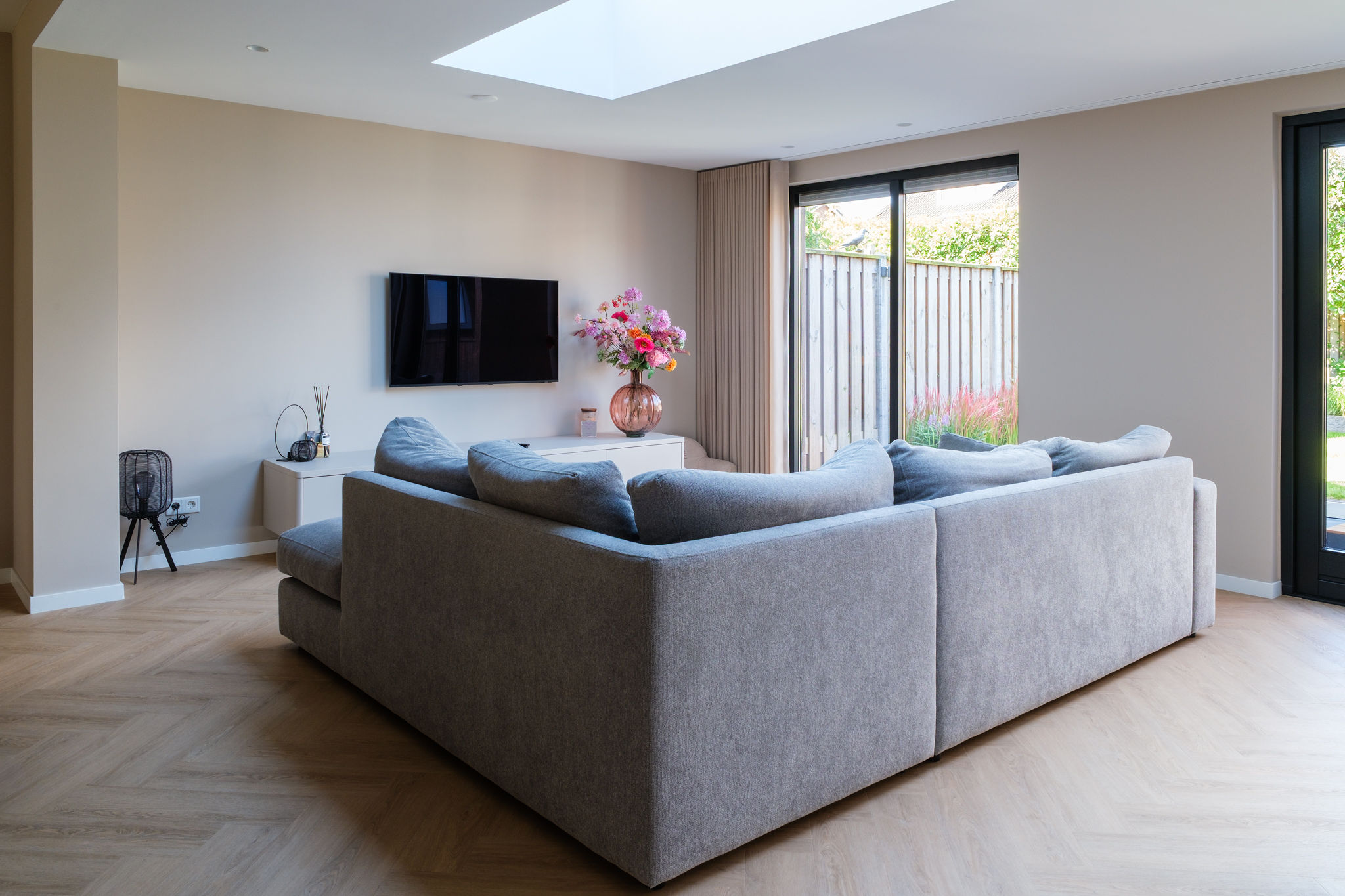 De bewoners kozen voor een gladde wandafwerking — een populaire keuze vanwege het strakke effect en de vrijheid in kleurgebruik. In dit geval viel de keuze op Dune van Eric Kuster. De nieuwe PVC-vloer sluit daar naadloos bij aan en biedt een rustige, duurzame en onderhoudsvriendelijke basis voor het interieur.